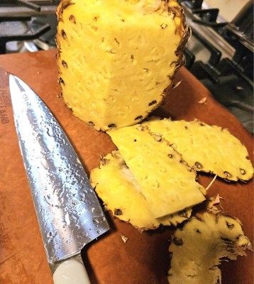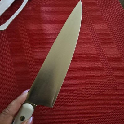 [This review was collected as part of a promotion.] This knife is sharp ! Great for sectioning/chopping larger and harder items such as pumpkins, pineapples (peels), hard cheeses, apples, celery etc. Items that require a rocking back and forth motion to break down are ideal tasks for this knife. The handle is comfortable to hold. Its off white color hasn't attracted any food stains. A beautiful piece to all to you knife collection.