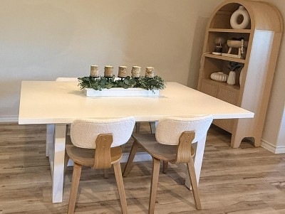 • Light oak finish with upholstered chair backs in a white boucle-like fabric
