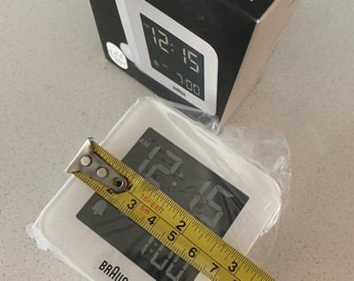 Clock is 3"x3" not 5"x5" as advertised. The backlight does not stay on and the clock becomes very light. Easy to use and small and sleek. Probably better as a travel clock vs. bedroom.