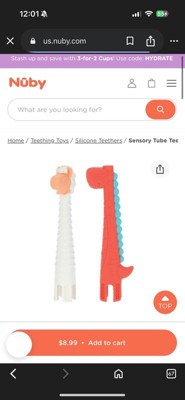 [This review was collected as part of a promotion.] This nuby tube teethers are a great soft toy with cute and eye catching colors the small hands were thrilled with its ez grip and fun characteristics of it. Helps baby’s to calm down when there teething.