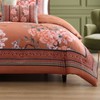 The terracotta, apricot and warm green tones of the Rossana 5 Piece Comforter Set bring a peace and serenity to this Asian inspired floral pattern. A unique and ornate border frames this print, emphasizing its beauty. The reverse side features soft, tonal flowers tossed randomly. To enhance the printed shams and comforter, there is one pillow with a stunning, fully embroidered group of flowers and a second printed pillow showing off the border design. The comfy 100% cotton sateen comforter set includes 2 shams, 1- 18" x 18" pillow and 1- 22" x 12" pillow. As a bonus, the set is packaged in a reusable self-fabric tote.