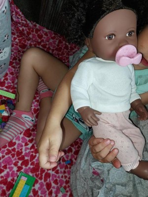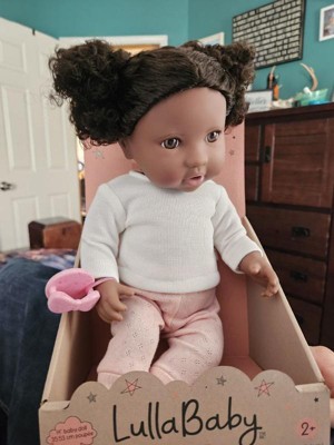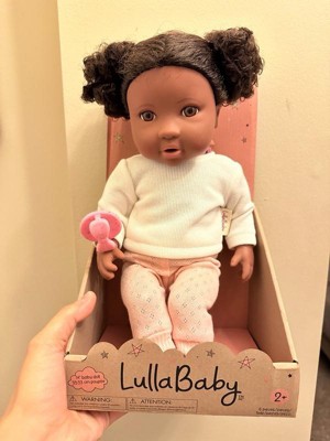 Discover precious playtime moments with LullaBaby. Made with lovable details and realistic features, this 14" baby doll has curly dark-brown hair to style, brown eyes, and a cuddly soft body for little hugs. Plus, kids can explore fashion fun and sweet storytelling with baby's cute sweater and pants outfit. It has easy-open closures to quickly put on and remove during changing time, and the pink pacifier fits in baby's mouth for soothing role-play. LullaBaby dolls are a must-have for parents looking to nurture young hearts and minds at an early age, encouraging imagination and inspiring kindness as kids play and grow with their baby dolls. Safety tested to meet all regulatory phthalates and BPA requirements. Makes a wonderful gift for kids ages 2 years old and up and is the perfect first baby doll for toddlers.