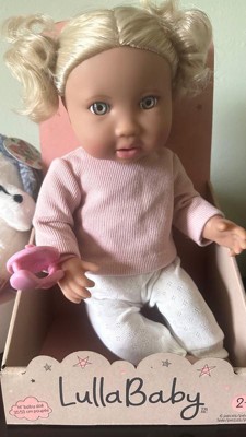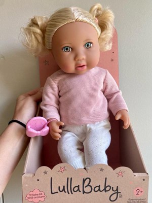 Discover precious playtime moments with LullaBaby. Made with lovable details and realistic features, this 14" baby doll has wavy blonde hair to style, bright blue eyes, and a cuddly soft body for little hugs. Plus, kids can explore fashion fun and sweet storytelling with baby's cute sweater and pants outfit. It has easy-open closures to quickly put on and remove during changing time, and the pink pacifier fits in baby's mouth for soothing role-play. LullaBaby dolls are a must-have for parents looking to nurture young hearts and minds at an early age, encouraging imagination and inspiring kindness as kids play and grow with their baby dolls. Safety tested to meet all regulatory phthalates and BPA requirements. Makes a wonderful gift for kids ages 2 years old and up and is the perfect first baby doll for toddlers.