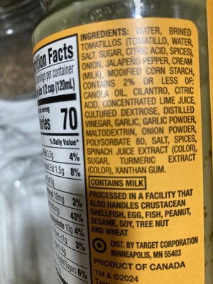 water, brined tomatillos (tomatillo, water, salt, sugar, citric acid, spices), onion, jalapeno pepper, cream (milk), modified corn starch, contains 2% or less of: canola oil, cilantro, citric acid, concentrated lime juice, cultured dextrose, distilled vinegar, garlic, garlic powder, maltodextrin, onion powder, polysorbate 80, salt, spices, spinach juice extract (color), sugar, turmeric extract (color). xanthan gum.
