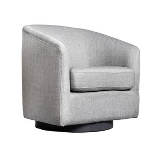 Product Name: Emma and Oliver Club Style Barrel Accent Chair with 360 Degree Swivel Woodgrain Vinyl Wrapped Base and Sloped Armrests in Light Gray Fabric Upholstery
