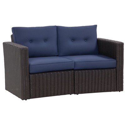 Outsunny Outdoor Wicker Loveseat, Patio Furniture Couch with Cushions, 2 Seat PE Rattan Sofa, 2 Throw Pillows for Porch, Backyard, Pool, Blue