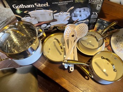 Gotham Steel Cream 15-Pc Ultra Nonstick Ceramic Cookware Set with Utensils with Gold Handles