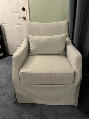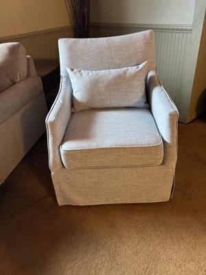 [This review was collected as part of a promotion.] I usually sit in my recliner but it broke. I was looking for a new chair and this one looked really nice. I like that it swivels and the color is neutral for any space. The chair has a nice design and it's comfortable. I like that it came with a little pillow. The only thing is that I wish it was more comfortable. It's no recliner, but I am really happy with it. Beautiful chair.