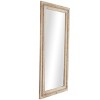 - Clear reflective mirror is securely encased in the brown whitewashed wooden frame