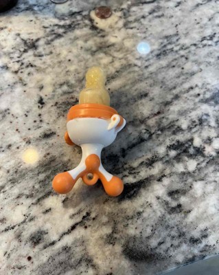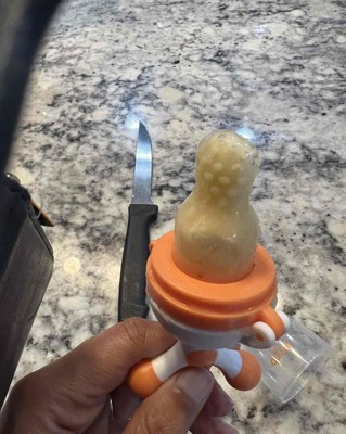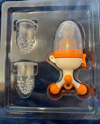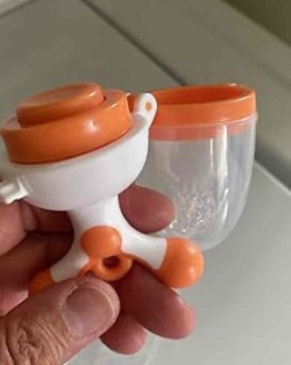 This is the best version of a fruit feeder that ive used. It has 3 different heads that can be used to transition with baby’s age. I started my son with the flattest one and added breast milk to it. Just FYI if you are going to put milk in these, it’s easiest to get a silicon milk cube tray so they freeze in this size. He can hold it by himself and will chew on it for 15 minutes until the milk it’s finished. I haven’t used fruit yet, but I’m going to start since he loves using it so much! I’ll probably transition to the next size! I received an incentive to write this review.