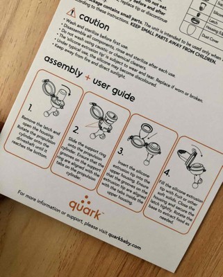 This baby fruit feeder is a very easy and convenient way to introduce your child to new foods. My infant gets very excited seeing it. Easy to wash and reload with the fruit you want. Washing it is simple and quick. Comes with three silicone feeding tips that are strong and efficient. I would recommend to any parents with infants. This product us made by quark. 5 stars all the way.