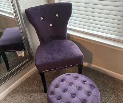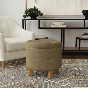 This Velvet Tufted Round Ottoman features a lift-off lid with all over button tufting for classic style. Upholstered in soft and durable velvet, this elegant round ottoman has wood legs in a rustic brown finish. Use as a storage ottoman to hide accessories in a bedroom, to store books or magazines in a living room, or to keep controllers or remotes nearby but out of sight. Pair two together for added impact. This tufted ottoman is available in a range of rich velvet colors with coordinating accent items in the same hue. Easy to assemble and maintain. Please note that fabric and wood colors may appear slightly different due to variations in lighting or screen settings.