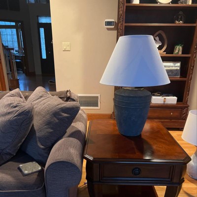 Lamp size and width are substantial. To the touch, lamp feels plastic. Color is more of a charcoal gray than shown. Lampshade is white linen. Will and be modifying the lamp with some chalk paint to make it lighter.