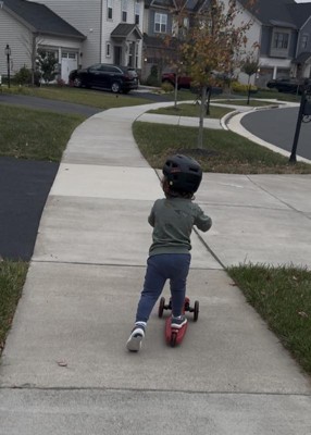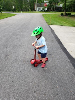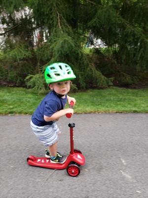 Radio Flyer sent me with a scooter to test and try out. After a few tries, my 3 year old started to get the hang of riding it. He’s never ridden a scooter before, but he has a balance bike, bike with training wheels, and a wiggle car and rides them all really well, so he’s used to balancing, steering, breaking, etc. He’s been practicing turning it, but he hasn’t been able to successfully use the break yet (located on the back of the scooter), and instead he just steps off it. I’m hoping after a few more rides, he’ll get the hang of steering better better and learn to break, but so far he said he likes it! Only downside is the weight limit - as the description says for ages 2-5, but it only has a 44lb weight limit.