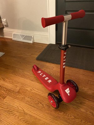 I was given a Flyer Glider Jr. in order to test and review it and I'm very happy with it! My three year old helped me assemble it-- the picture directions and pieces were very easy to put together. She was up and riding in minutes. I can't believe how smooth a ride it was, they must be great bearings in there. The leaning to turn matched right with her balance and the brake on the back wheel was really useful inside the house. She felt more comfortable with the handlebars level almost to her shoulders, but within a few times she was doing one footed, squatting, and the scooter stayed very balanced. She tried to take some sharp turns and couldn't quite do that at speed, but she probably shouldn't be anyway. Sleek, not clunky, sturdy.