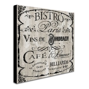 This ready to hang, gallery-wrapped art piece features a square black and white vintage sign for a French bistro.Whether it's trend-right dinnerware collections, fabric,'hostess-ware'and home decor accents, gift items, wall decor or paper goods, Color Bakery is unusually diversified when it comes to designing in widely varying styles and art genres. From repeat patterns to botanicals to coastal and kitchen (food) art, Color Bakery is synonymous with diversity.Giclee (jee-clay) is an advanced printmaking process for creating high quality fine art reproductions. The attainable excellence that Giclee printmaking affords makes the reproduction virtually indistinguishable from the original piece. The result is wide acceptance of Giclee by galleries, museums, and private collectors. Gallery wrap is a method of stretching an artist's canvas so that the canvas wraps around the sides and is secured a hidden, wooden frame. This method of stretching and preparing a canvas allows for a frameless presentation of the finished painting.