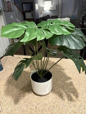 Amp up your home decor with this Monstera Artificial Plant from Room Essentials™. This natural-looking faux monstera plant brings a lively vibe to your home decor, and it comes potted inside a white melamine container with faux soil for easy display on any flat surface. Plus, it stays beautiful at all times without the hassle and worry of maintenance.