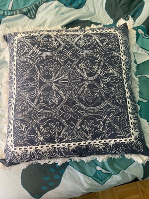 [This review was collected as part of a promotion.] This decorative pillow has a fun bohemian vibe which adds some character to any home decor. The navy blue color is neutral enough to pair with most colors. It has a pretty pattern and a cute fringe. The material is not super thick but it isn’t flimsy either. I wish the pillow cover could be removed for cleaning but it is not encased. The pillow itself is plump and thick. The filling is stuffed pretty full. I know it’s meant to be decorative but because the pillow is so plump and full, I’ve been using it temporarily for other purposes. I’ve had some shooting pain in my leg. I think the wooden chair I sit on may contribute to this condition. When I got this pillow, I’ve been using it as a cushion on my chair and it has helped significantly. I like that it is larger and plumper than most pillows and cushions.