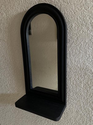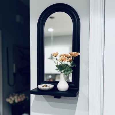 This Wood-Framed Wall Mirror with Shelf from Hearth & Hand™ with Magnolia combines style and functionality. The wall-mount mirror showcases an arched top and a bottom shelf to hold your essentials. Encased in a black wood frame, it easily complements your existing decor.