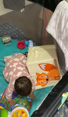 [This review was collected as part of a promotion.] This portable play yard comes in super clutch. It can be used indoors or outdoors, and in the Texas heat, the cover for the outdoors is a huge plus! It’s big enough for my kiddo to crawl around and have enough space without feeling too constricted. It’s super easy to set up (and take down). Because of that, this is my go to travel play pen as well!