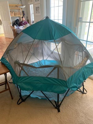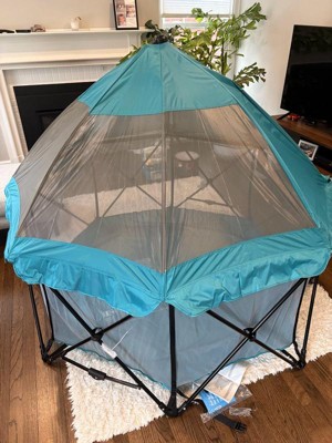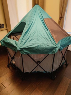 [This review was collected as part of a promotion.] Perfect to keep baby contained! And my toddler loves playing in it too!! Super easy to set up and store it is a little on the larger side and the sun protector is amazing for outdoor use. It feels really nice and sturdy and well made and so perfect to bring with you as it folds up really nicely.