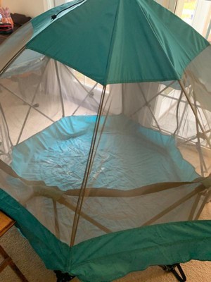 [This review was collected as part of a promotion.] This has an umbrella making it perfect for outside but without it, it’s great for indoor use . We used it recently outside at a family barbecue to corral all the littles and it worked great!! Super simple to set up, and super easy to fold up and store . My baby is 9 months and can’t escape!