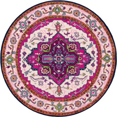 The colors and quality are exactly what I would expect from a Safavieh rug. This is a plush, wool rug with a think pile. The fibers are dense and it have a luxurious feel when walking on it. There was no smell as I have experienced with other wool rugs. The colors are vibrant and rich and the pattern is so pretty. I feel the colors are close to what you see on screen but the pink is definitely toned down and in person. I was nervous it would be on the garish side for color but it is truly a beautiful color combination.