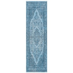 The luxurious cotton fibers provide a soft, inviting texture underfoot, perfect for your everyday comfort. Immerse yourself in the tranquil shades of blue that paint a serene backdrop for your interior decor. The runner rug features a rich, intricate pattern that exudes a timeless aesthetic, drawing inspiration from classic design motifs while presenting a modern color palette suited for today's homes.