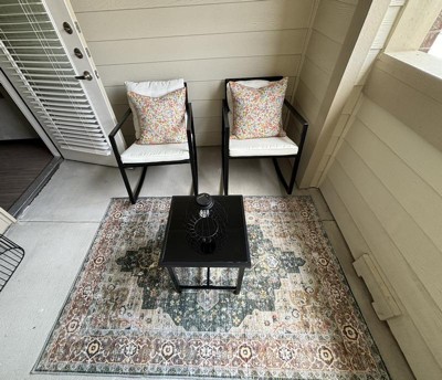 I’m extremely satisfied with this purchase!!! I paired this beautie on my back patio. It is very soft material for the feet and thin for easy cleaning in the wash. The grip layer on the bottom sticks to concrete well and does not slide around at all. I’ll emphasize that it is very thin, so a good rug pad is needed for cushion and sliding if you’re using on hardwood/tile floors. Overall, 10/10! No complaints here!