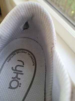 I ordered these from DSW on Dec 30, 2024. Wore them inside walking on a treadmill until the weather was warm enough for me to go outside. Walk 20-50 minutes usually 3-4 days a week in my neighborhood. The shoe is wide but I laced it up tight and didn't think anything about it. Now there is a wear spot in the right heel right where my heel bone hits. The thin layer of fabric and thinner layer of foam is worn completely away, and the hard plastic heel frame is exposed. I found that I also have holes in my socks at that same spot because I am rubbing against the worn fabric and hitting the hard surface. The construction of the heel is too wide since it allows too much rubbing, and the cushioning at that spot is negligible. Five months of light-normal wear should not wear through that fast. Too bad, I used to love Ryka shoes. But the quality is not the same. I should have known, since DSW sells the 'badly designed' shoes for the manufacturers. The irony is, the walking shoes I replaced were 15 years old, still in good shape, after much heavier wear, and I only got rid of them because they looked 15 years old. They had a thick heavy sole, thick internal padding, arch support and a roomy toe box. All the manufacturers just aren't making anything as well anymore.
