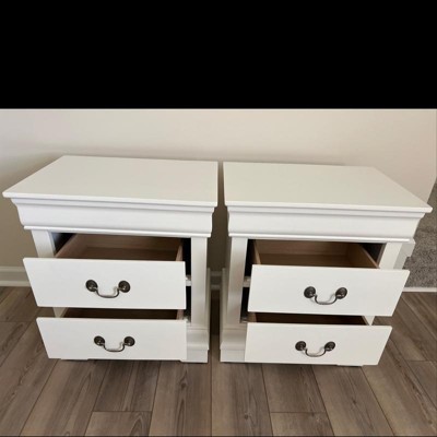 This vintage bedside table, featuring a 21.5" L × 16" W tabletop and embracing two drawers, works to meet your daily storage needs for keeping the space around this nightstand tidy and organized. The frame and the tapering legs are made from high hardness and durable rubberwood, ensuring the stability and solidity of the whole table body. The MDF and particle board adopted are certified safe. This vintage bedside table is designed to serve you for years.