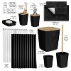- Complete Bathroom Set: Toothbrush holder, tumbler, soap dispenser, soap dish, bathroom trash can, toilet brush and holder set, and fabric shower curtain set with clear shower curtain liner and 12 shower curtain hooks.