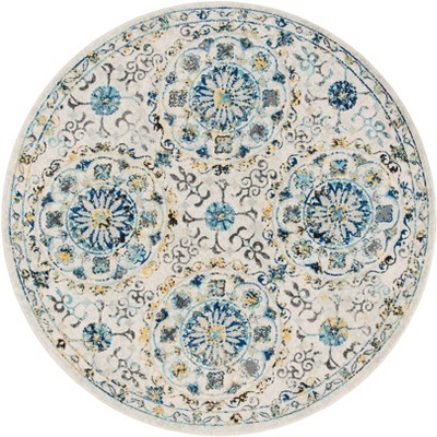 Embrace timeless elegance and enduring quality with our exquisite area rug, a round masterpiece of sophisticated design tailored to enhance your living space. Mesmerizing in its intricate patterns and pallet of rich ivory and serene blue hues, this luxurious 6'-7" X 6'-7" round rug serves as a harmonious centerpiece for your decor.