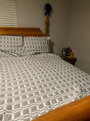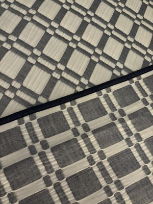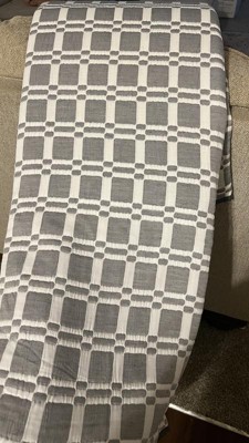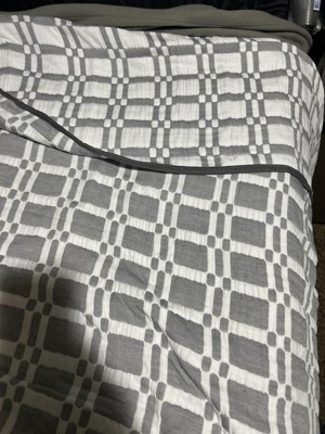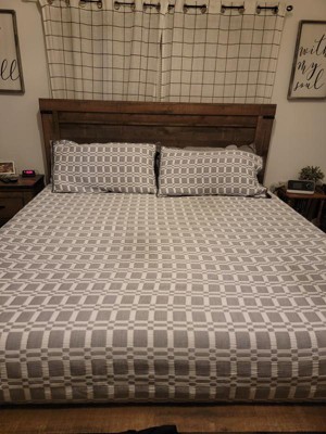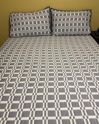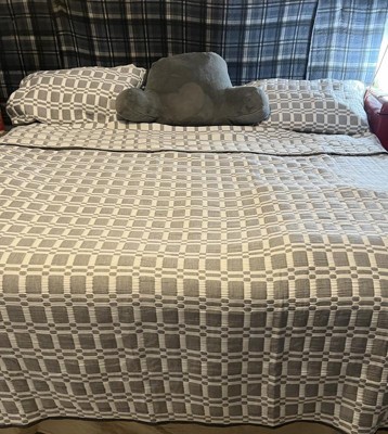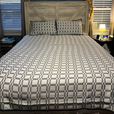 [This review was collected as part of a promotion.] Beautiful light weight checker reversible coverlet -grey color. It’s made from 100% polyester, so easy washing. Comes with coverlet & 2 pillow shams. I love the lightness of this & still feels like you have a cover. It’s beautiful! Fits true to size. I mean you could use just as a blanket also.
