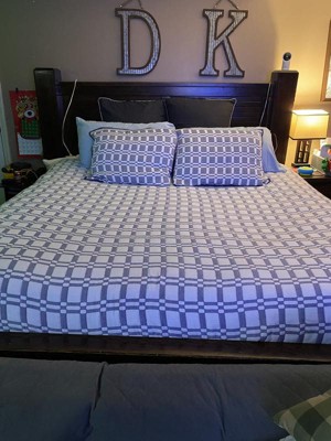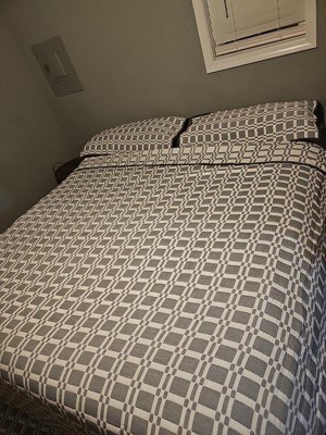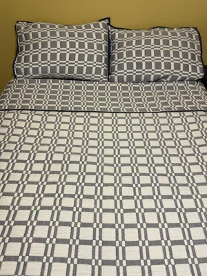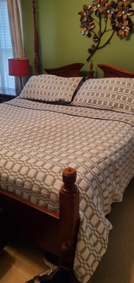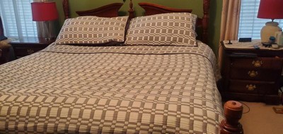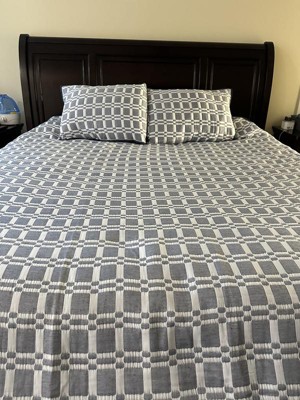[This review was collected as part of a promotion.] This beautiful coverlet fits perfect on my king size bed! I'm so picky about the blanket covering both sides of the mattress plus a little extra and this one does just that! It's a square or tile look pattern and a beautiful blue and white color. It's a very gender neutral and any age appropriate coverlet. My fiance complains about our comforters being to girly and this one he agreed on with its beautiful natural look. It comes with the coverlet and two matching pillow cases. The coverlet is reversible but the design is on both sides. The pillow cases on the other hand feature a solid blue on the other side. This coverlet sing heavy allowing those hot sleepers to fee comfortable when sleeping under it. It's soft feeling not scratchy like other blankets giving you an overall nice night of sleep.