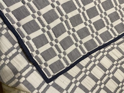 [This review was collected as part of a promotion.] This 3 Piece Reversible Matelasse Coverlet Set is very nice. I am in the process of making over my bedroom and painting the walls so I am happy to get this set for my bed. I really like the design and that it has a simple clean look to it. The colors compliment each other very well and I like the navy trim around the edge of the coverlet and shams. I like that the shams completely enclose the pillow and they are a solid navy color on the back. The size is just right and fits my bed perfectly. I also like that it is lightweight and not too thick since I like it to be cooler at night when I sleep. I like the texture and it is very comfortable. It appears to be very well made as I saw no loose threads. I am very happy with this set and if you are looking for a coverlet set this is a good one.
