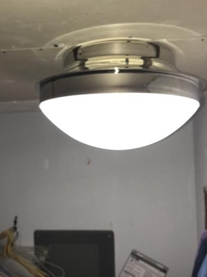 [This review was collected as part of a promotion.] A beautiful polished nickel light fixture. This light features a closed housing for 2 light bulbs. It’s provides a great output of light with the frosted glass without being too harsh on the eyes. A 13.5 fixture, it’s a good size and not overly large or too small. It’s heavy duty feeling and very well made. Great fixture for sure!