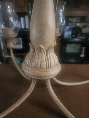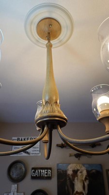 [This review was collected as part of a promotion.] This is a beautiful fixture. It was packed well and arrived in perfect condition. The carving on the wood column gives it a certain class not often seen on chandeliers. We also liked that this is a solid fixture - the wood is of substantial weight as are the glass shades. Truly a talking point in our dining room!
