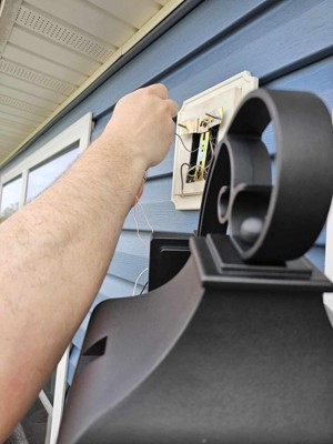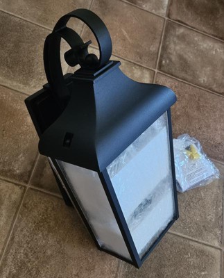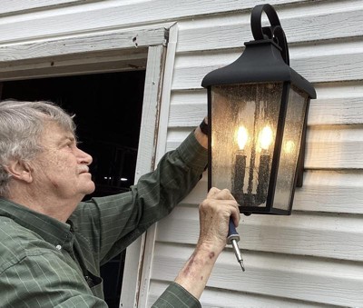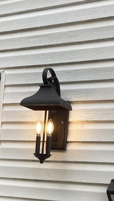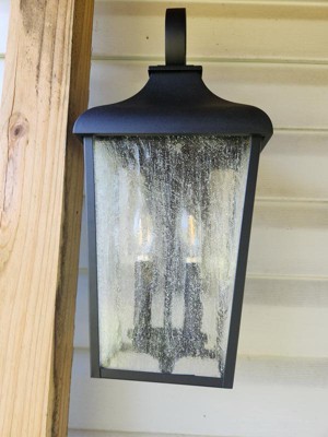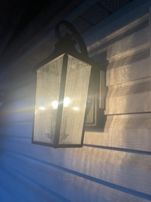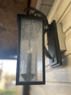 [This review was collected as part of a promotion.] Forestdale 18.50" 2-Light Outdoor Wall Light with Clear Water Glass in Textured Black My husband and my daughter put this up for me. It took them about 1/2 hour. It was easy to install. The hardest part was holding up the lights clear water glass globe. Which wasn’t hard at all. The light fixture is a dull black I would referred it to be a little shinier. For the most part, I am very happy with the Forestdale outdoor light. I really like the clear water glass globe and candle light look.