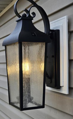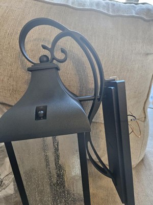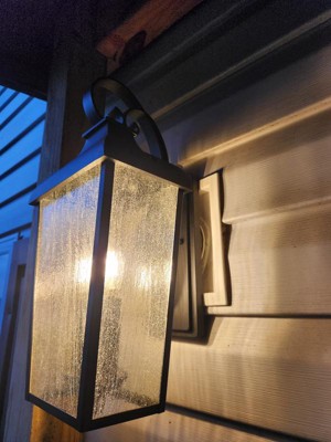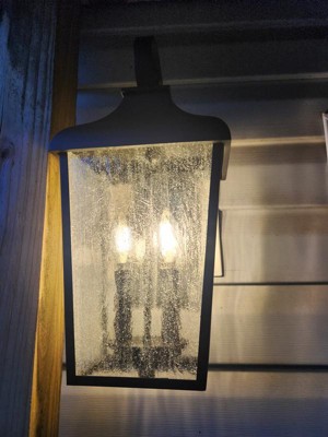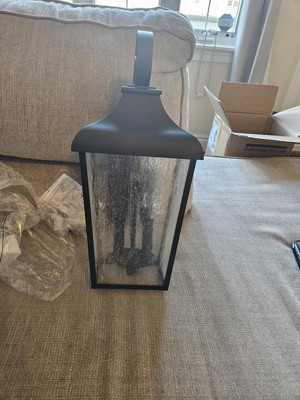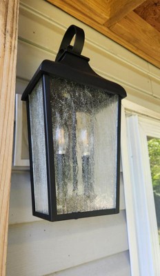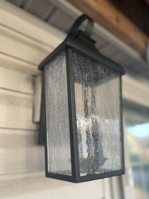 [This review was collected as part of a promotion.] I was so excited to get this gorgeous outdoor wall lantern to put near our deck outback of our home. It arrived well packaged and had the basic hardware needed for a simple switch from existing light fixture. Very high quality! I absolutely love the looks of it, the rustic farmhouse vibe is the theme I love so very happy with this light. The seeded glass is a very nice touch as well. It does a great job lighting up our deck with the 2 bulbs. (not included)