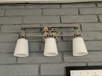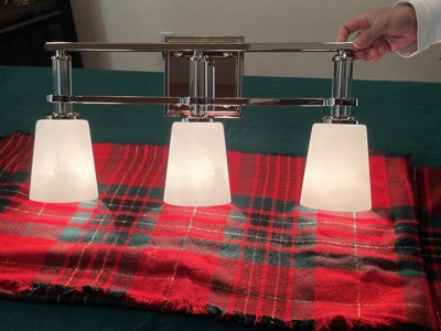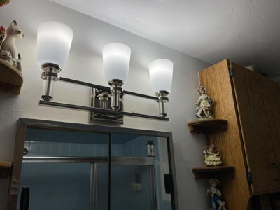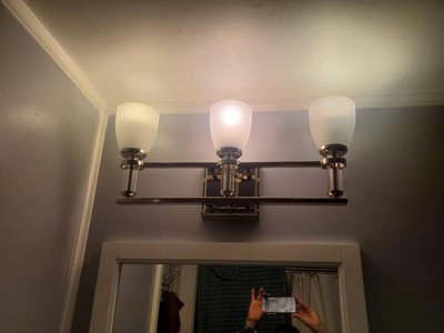 [This review was collected as part of a promotion.] This is a very nice looking 3 light vanity light. It is a brushed nickel metal with 3 satin finished lights. Very elegant looking. We actually hung the light upside down and put it in our Arizona room above our coffee bar. The light looks very decorative in there, and really lights up the area. It is a quite versatile light, not just for a bathroom. It was very easy to install also even into the brick.