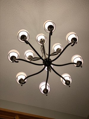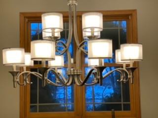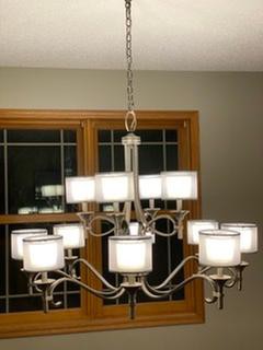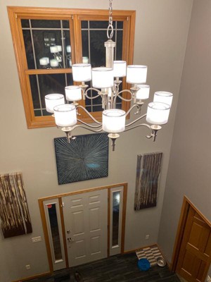 [This review was collected as part of a promotion.] This chandelier fit beautifully in my 2 story entryway! The fabric shade over the frosted glass is a subtle but elegant touch. The installation was smooth and it gives off a really good amount of light with candelabra LED bulbs (800 lumens). It is not too heavy to get up into high spaces. We installed the fixture and added all the bulbs and shades afterward. The instructions were very thorough and easy to follow. We replaced an outdated chandelier and couldn’t be happier with how updated this made the entry appear.