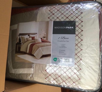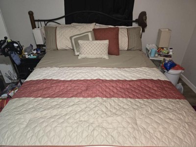 [This review was collected as part of a promotion.] The set came packed perfectly in a transparent sturdy package which can be used to store it back. All of the decorative pillow , pillowcase and sham came very nicely vacuumed pack. when I took the comforter out it had some creases and needed to be ironed. I have a dark wood bed and this set was a perfect complement to it. The 3 different colors used are in perfect blend with each other. It looked amazing. Loved the details in the comforter, the quilted design and the pintuck ( I think that’s what it’s called) looked very pretty on the comforter. All three decorative pillows had different design which was amazing . One had a very delicate embroidery and once was plain with 2 different color combinations and the last one was in a beautiful rust color with quilt design. All three pillows went well with the set and enhanced its looks even more. The comforter seems pretty well made, it did have some lose threads hanging which was easy to cut and didn’t change the design or anything. The comforter is thick and could be used for all the season. It’s is soft and fluffy , seems to be made from good material. I love this set and the fact it matches my bedroom set so well is an add on.