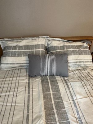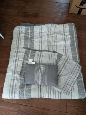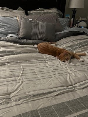 [This review was collected as part of a promotion.] The Rhodes 4-Piece Stripe Comforter Set with Throw Pillow is a fantastic addition to any bedroom. This set features a sophisticated design with black stripes elegantly contrasted on a white and gray background, which adds a modern touch to my bedroom decor. The comforter and pillows are crafted from a high-quality cotton/poly blend. This combination not only enhances the softness and comfort of the bedding but also improves airflow, making it perfect for a good night's sleep. Additionally, the blend helps reduce wrinkles and significantly increases durability, ensuring the set looks brand new for a long time. The comforter has a lightweight feel but provides ample warmth, making it suitable for all seasons. The included throw pillow is a charming addition that ties the whole look together. It’s not only decorative but also quite comfortable for lounging. One of the best aspects of this comforter set is its machine washability. I've washed it multiple times already, and it holds up exceptionally well. The colors remain vibrant, and the fabric maintains its softness without pilling or losing its shape. The stitching is solid, and the overall construction is clearly of high quality, which is evident after each wash. The Rhodes 4-Piece Stripe Comforter Set with Throw pillow is an excellent choice for those seeking stylish, comfortable, and durable bedding. I highly recommend it.