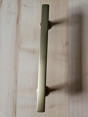 [This review was collected as part of a promotion.] This handle is a beautiful champagne gold color. It has good weight to it. The holes align perfect to my cabinet door. It’s goes beautifully with the wood color.