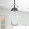 • This industrial style pendant light features an elongated glass diffuser captured in a sleek metal frame