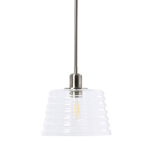 - This contemporary pendant light features a sleek metal frame adorned with a playful ribbed clear glass shade