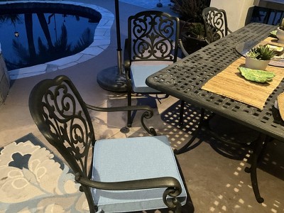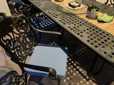 These are great! Especially for the price! I looked at pricier ones and I don't think I'd have liked them any better. They are a beautiful sky blue, nice thickness and give substantial support. Comfortable to sit on and look really nice. I bought 6 of these for our outdoor dining table. Don't hesitate on these - very good quality, arrived quickly - perfect!