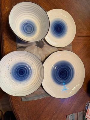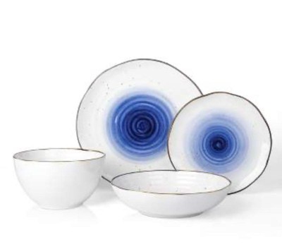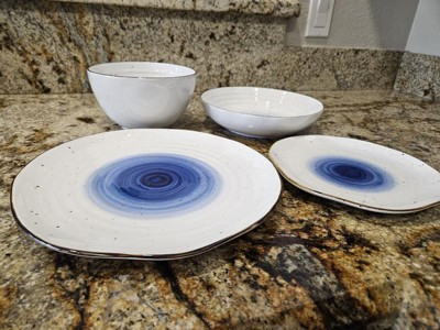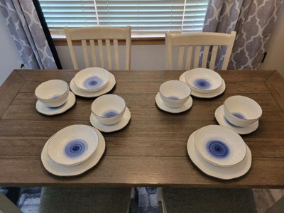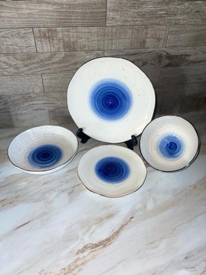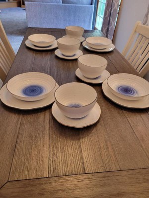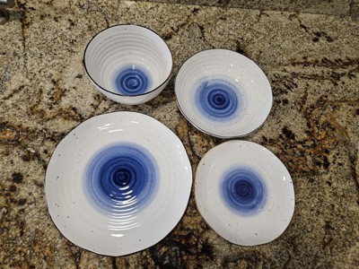 [This review was collected as part of a promotion.] This dinnerware set is perfectly what I want for my dinnner setting for 4 people. There are 4 dinner plates, 4 salad plates, 4 soup bowls and 4 pasta bowls. I love the design a lot. The touch of blue swirl in the middle makes the set look fancy, but the uneven brown edges and random brown spots maintain the rustic vibe. The set is made of high quality porcelain so it's diswasher and microwave safe. It's also lovely when people come over for dinner and you have a whole set of fancy beautiful dishes. Highly recommend it!