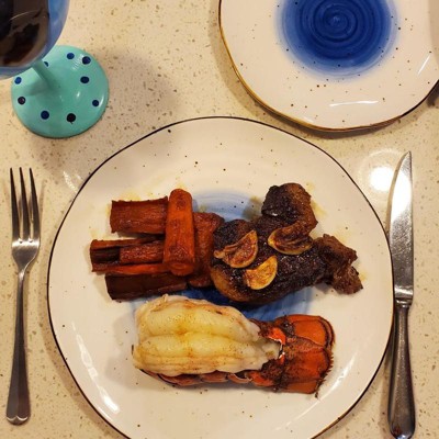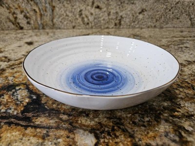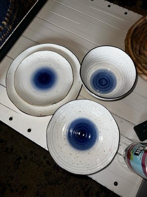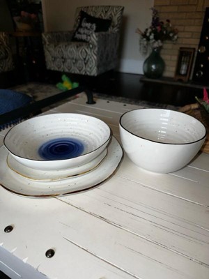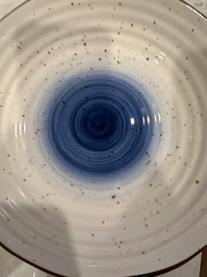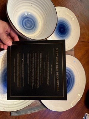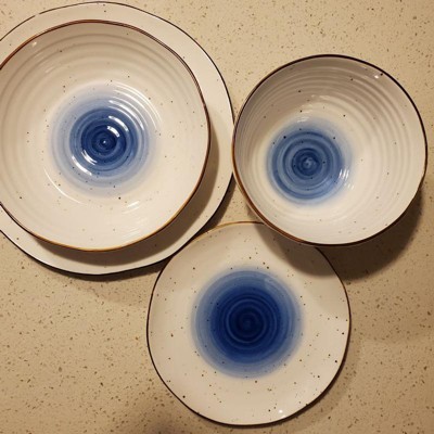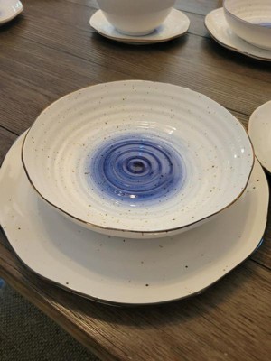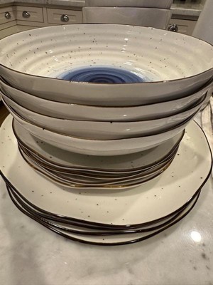 [This review was collected as part of a promotion.] Love this dinnerware set! The ridges, uneven edges and splatter pattern give it an organic and loose feel, but the edging and blue ground it with an unexpected bold elegance. I’ve run it through out dishwasher and it comes out perfectly every time. Biggest highlight: the low bowls! Perfect for salads or pastas and just the right size.